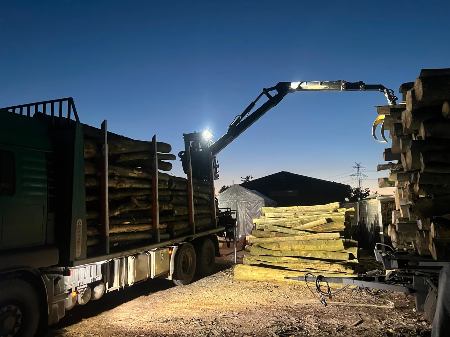 Bei der Anlieferung haben wir einen Ladekran am Lkw, mit dem wir das Stammholz für Sie abladen.
